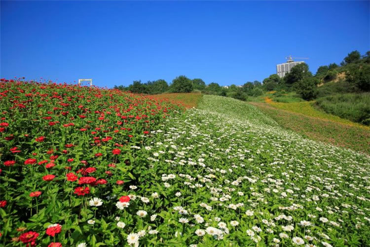 沿著小路拾級(jí)而上,百花爛漫,林木蔥郁,紅色的百日草、粉色的格;ā⒆仙霓挂虏、嬌艷欲滴的虞美人、絢麗多姿的醉蝶......從山谷中傾瀉而下,如同一條彩色的小溪,置身其中,好似沉浸于花香鳥(niǎo)語(yǔ)的蝴蝶一般翩翩起舞、流連忘返。