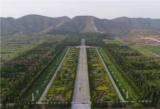 橋陵陵園略呈長方形,東西長2871米,南北長2836米,總面積852萬平方米。四面開辟有門,四角有樓。歷經(jīng)千年風蝕雨剝,唐橋陵所保留的石華表、石鴕鳥、石馬、石人、石獨角獸、石獅等五十余尊巨大石刻依然形態(tài)清晰,生動自然,其中的38尊排列在寬達110米、長625米的神道兩旁。