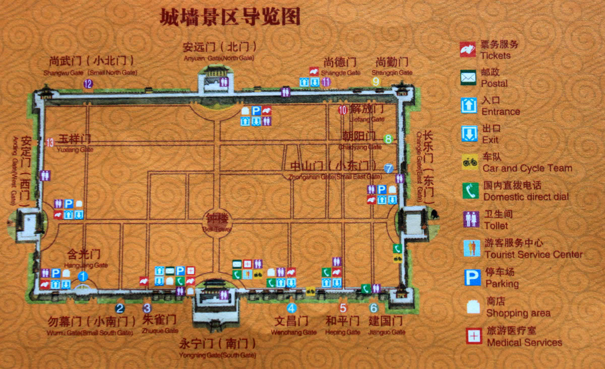 西安城墻現(xiàn)有城門18座,從永寧門開始順時針依次為:永寧門、朱雀門、勿幕門、含光門、安定門、玉祥門、尚武門、安遠門、尚德門、解放門、尚儉門、尚勤門、朝陽門、中山門、長樂門、建國門、和平門、文昌門。這18座城門的形成時間和規(guī)格各不相同。