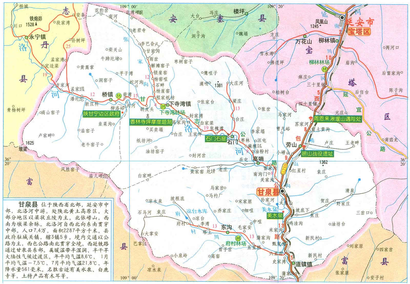 甘泉縣地處陜西省延安市中部,總人口73507人,其中農(nóng)業(yè)人口53600人,總面積2284.7平方公里。210國道、西延鐵路和即將開工建設的黃陵-延安高速公路穿境而過,交通十分便利。