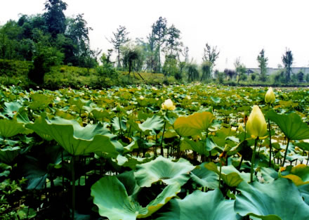 潭內(nèi)種植有許多觀賞荷花,初夏時(shí)節(jié),碧荷連天、綠滿大地、蓮花朵朵,香飄滿園。輕風(fēng)吹過(guò),花兒嬌羞欲語(yǔ)、隨風(fēng)起舞、揺曵生姿,為這寧?kù)o的湖光山色憑添了許多的生機(jī)和靈氣。由此讓我們不禁想到周敦頤的《愛蓮說(shuō)》:“蓮,花之君子者也!薄俺鲇倌喽蝗,濯清漣而不妖,中通外直,不蔓不枝,香遠(yuǎn)益清,亭亭靜植,可遠(yuǎn)觀而不可褻玩焉。”