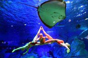 徜徉于多彩的海底世界,一覽多彩珊瑚、熱帶魚群以及兇猛的鯊魚構(gòu)成的海底世界。美麗的俄羅斯水秀演員、童話里的美人魚,搖曳身姿,共同舞動(dòng)海底深處的視覺(jué)奇跡。探訪深海的馴養(yǎng)師也將攜手兇猛鯊魚,演繹人鯊共舞。