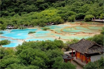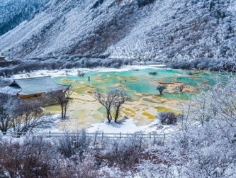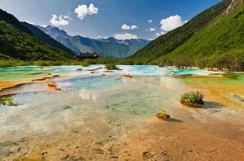 進入黃龍景區(qū),首先看到的是一組精巧別致、水質明麗的池群--迎賓池。池子大小不一,形狀奇特,色彩艷麗,錯落有致,四周山岳環(huán)峙,林木蔥蘢,山間野花競放,彩蝶飛舞。山間石徑曲折盤旋,點綴著觀景亭閣,倍添情趣。