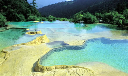 這一片景觀,還有緊傍森林的明鏡倒影池、掩映于杜鵑花叢間的婆蘿彩池和擁有彩池500多個,鈣化景觀中色彩最為豐富的爭艷池。