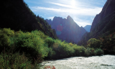丹云峽以俊秀印峽谷風光,成為黃龍的“五絕”之一。它擁有豐富的樹種、灌木和花草,是植物愛好者的天堂。丹云峽景區(qū)起子玉筍群峰,止于扇子洞,綿延18.5公里,落差1300米,峰谷高差為1000至2000米。這里冬天一片雪白,夏天山林翠綠,尤其是春天漫山遍野的紅杜鵑、秋天一路楓葉紅遍峽谷,那情景仿佛夕陽之下的火燒云從天而降,丹云峽因此而得名。山生云,樹生風,丹云峽幾乎每天都有云霧從林中升起,繚繞山間,時隱時現(xiàn)。丹云峽內森林密布,發(fā)源于雪寶頂?shù)母⒔,在峽內奇石怪巖的夾逼中奔游林間,好似一條白龍搖頭擺尾,與身邊的黃龍遙相呼應。