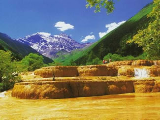 位于岷山主峰雪寶頂,下臨涪江源流——涪源橋,是一條長7.5公里、寬1.5公里的緩坡溝谷。溝內布滿乳黃色巖石,遠望好似婉蜒于密林幽谷中的黃龍,黃龍溝名即來源于此。明代(公元1368~1644年)在此修建了黃龍寺,用以奉祀黃龍。黃龍溝以它“奇、絕、秀、幽”的自然景觀而蜚聲中外,它酷似中國人心目中“龍”的形象,藏民稱之為“東日·瑟爾磋”,意為東方的海螺山(指雪寶頂)、金色的海子(指黃龍溝),并沿襲著一年一度盛況煊赫、波及西北各省區(qū)各族民眾參加的轉山廟會。 黃龍溝連綿分布鈣化段長達3600米,最長鈣化灘長1300米,最寬170米;彩池數(shù)多達3400余個;邊石壩最高達7.2米。