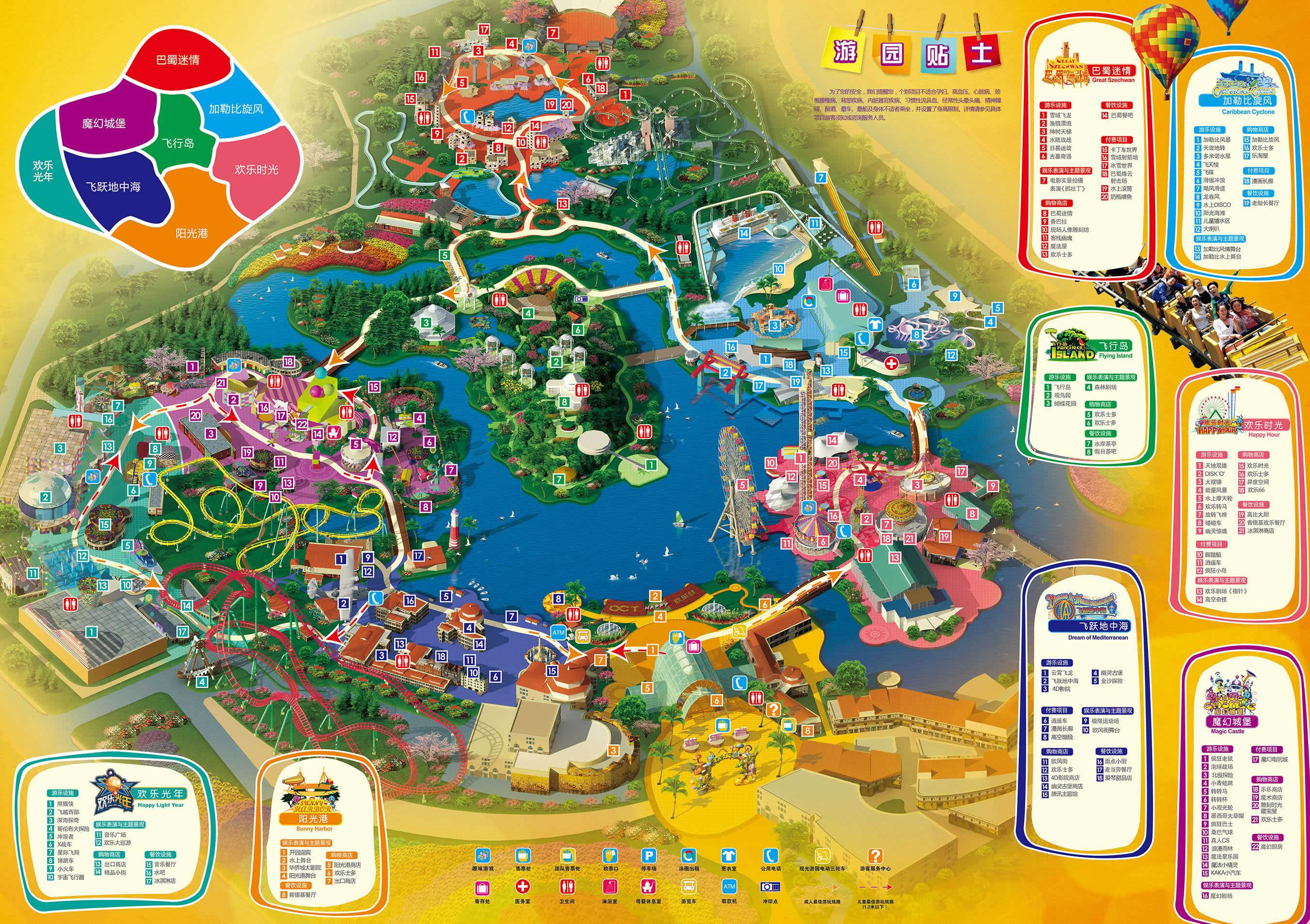 成都?xì)g樂谷占地51萬平方米,由陽光港、歡樂時光、加勒比旋風(fēng)、巴蜀迷情、飛行島、魔幻城堡、飛躍地中海、歡樂光年及絲路傳奇9大主題區(qū)域組成,擁有百余項景點。其中設(shè)置了159項體驗觀賞項目,包括超過54項娛樂設(shè)備設(shè)施、58處人文生態(tài)景觀、27項藝術(shù)表演、20項主題游戲和商業(yè)輔助性項目。