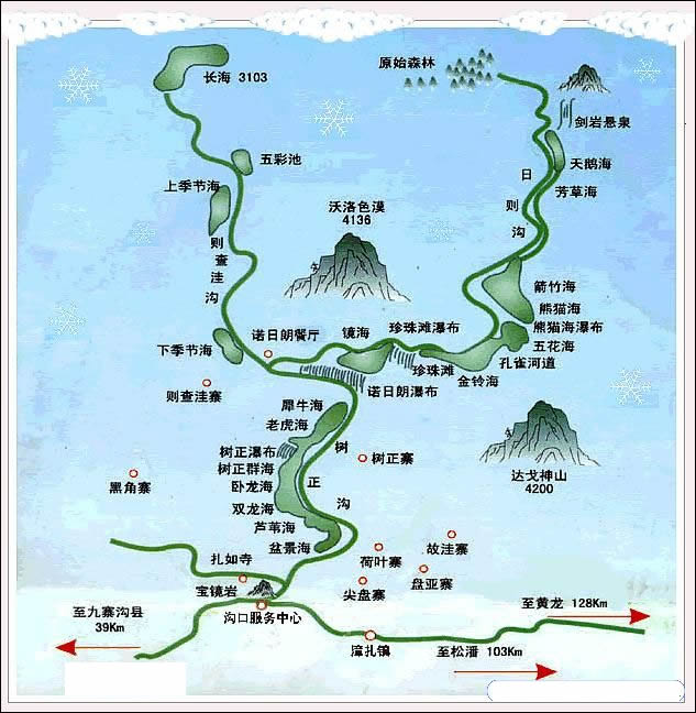 九寨溝國家級自然保護區(qū)內(nèi)有108個高山湖泊,它們大部分成群分布,面積大小不同,小的半畝,大的千畝以上。九寨溝有許多天池,其中最大的長達(dá)7千米,天池的四周覆蓋著郁郁蔥蔥的原始森林。九寨溝大型瀑布有17處,為九寨溝諾日朗瀑布。保護區(qū)內(nèi)最大的湖泊為長海子,它由此向南達(dá)7千米。