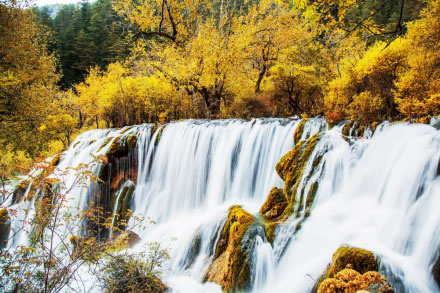 諾日朗瀑布海拔2343米,高24.5米、寬320米,是中國最寬的高山鈣華瀑布。滔滔流水自諾日朗群海而來,從瀑頂樹叢中傾瀉而下,像數(shù)條潔白的哈達(dá),水勢浩大,聲震山谷。寒冬時節(jié),瀑布成了一幅巨大的冰幔,無數(shù)的冰柱懸掛在陡崖之上,成為罕見的冰晶世界,造型各異的冰雕迎光透著幽幽的藍(lán)色魅惑,是九寨溝六絕之一“藍(lán)冰”。