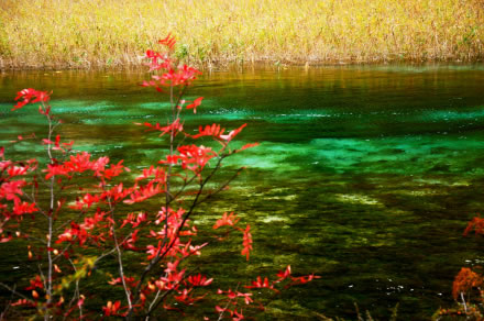 孔雀河道是從五花海出水口深谷里的一條河道?兹负拥老袷亲咴谝桓弊顫饬业纳蕜(chuàng)造出來的油畫里,又猶如孔雀羽一樣,將塵世間最美麗的藍(lán)和綠都融合在一起。