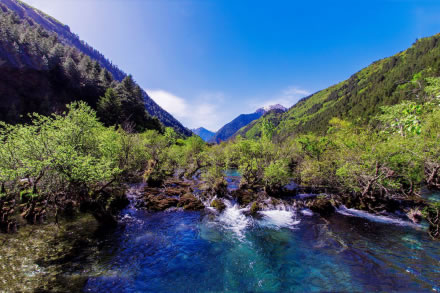 春風(fēng)吹拂,沉睡的九寨溝蘇醒了。冰雪融化,新綠發(fā)芽,春水的顏色映著山色,嬌嫩得讓人不忍探視,仿佛只要輕輕地一口氣都能讓它消失。水邊道旁,鬧哄哄開滿了不知名的美麗山花,桃紅、絳紫、靚藍(lán)、鵝黃,繁華似錦,爛漫一路。溫柔而慵懶的春陽吻接湖面,愛撫春芽,也悸動了你久閉的心門......