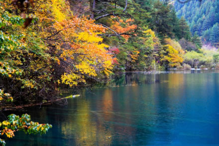浪漫的秋風(fēng)也吹來了九寨溝最為燦爛的時節(jié)。山林暈染成色,除了綠色以外,還呈現(xiàn)出金黃、火紅等色彩,五彩繽紛,倒映在明麗的湖水中,湖山同色,湖水也斑斕似錦了,一時間竟然不能分清哪里是山哪里是水,十分迷人。