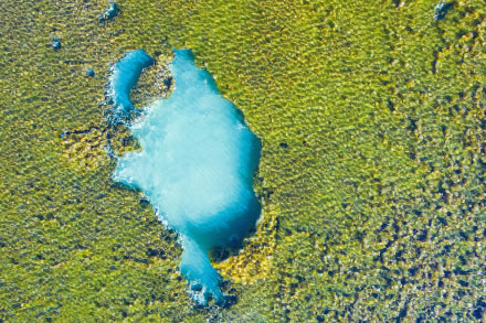 嫩芽悄然出現(xiàn),一抹抹新綠因重獲生機而生長得日益茂盛,春風(fēng)吹醒了封凍的海子,吹皺了一汪碧水,水色是幽靜的藍(lán)、清新的綠、淺淺的黃。無風(fēng)的晴日,山林樹色盡數(shù)倒映其中,呈現(xiàn)出對稱之美。