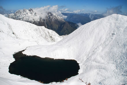 黑湖(黑海)藏名措拉,面積約5畝,深8米,這是相當(dāng)深、相當(dāng)?shù)湫偷囊粋冰斗湖遺跡。據(jù)資料所述,早年當(dāng)?shù)夭孛裉旌登笥陼竭@個湖,湖上常年飄有低云,在下面大聲呼喊,上面的云就會落下雨滴。夏天的黑湖附近是一片草場,冬日雪景又是另外一番景觀。