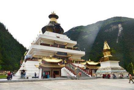 目前,九寨溝景區(qū)僅保留了樹正寨、荷葉寨、則查洼寨這三個村寨,善良淳樸的他們,用微笑迎接著前來九寨溝的每一個人。而在這些村寨中,最壯觀的莫過于樹正寨前的“九寶蓮花菩提塔”,七彩經(jīng)幡隨風(fēng)飄蕩,圣潔的白塔在陽光下仿若閃著光,這里也是眾多游客到來時,都會雙手合十,輕聲祭拜的地方。