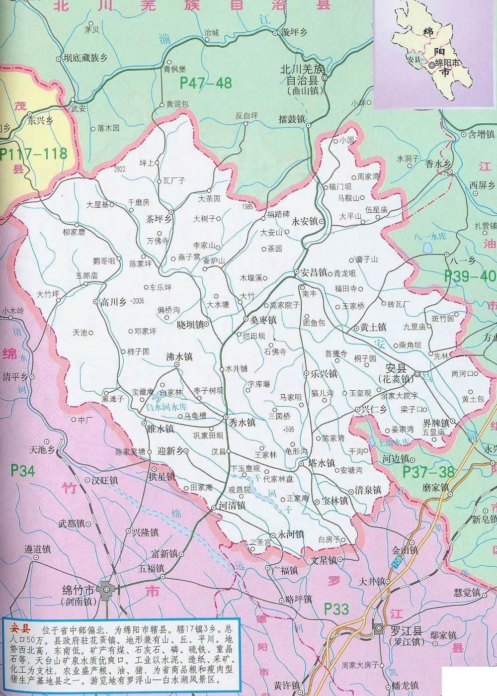 安縣位于四川盆地西北部,距成都110公里,距綿陽(yáng)科技城10公里?h境山丘壩兼有,幅員1404平方公里??cè)丝?0萬(wàn)人,轄4鄉(xiāng)16鎮(zhèn)。安縣氣候宜人,生態(tài)環(huán)境優(yōu)美。屬亞熱帶濕潤(rùn)季風(fēng)氣候,氣候溫和,雨量充沛,四季分明,日照充足,無(wú)霜期長(zhǎng)。年均氣溫16.3℃,年均降水量1260mm,空氣質(zhì)量常年達(dá)國(guó)家二級(jí)標(biāo)準(zhǔn),森林覆蓋率達(dá)42%。縣內(nèi)交通四通八達(dá),人流、物流進(jìn)出快捷方便 ,現(xiàn)代通訊覆蓋全縣,并開(kāi)通了ADSL業(yè)務(wù)和高速寬帶網(wǎng)絡(luò),光纖有線電視遍布城鄉(xiāng)。自然資源豐富,有水泥石灰石、磷礦、煤、硫鐵礦、重晶石、鋁土礦等礦產(chǎn)資源29種,儲(chǔ)量豐富;有動(dòng)物資源948種,其中大熊貓、金絲猴等國(guó)家一、二級(jí)保護(hù)動(dòng)物77種;有植物資源814種,其中銀杏、珙桐等國(guó)家一級(jí)珍稀植物及棗皮、杜仲、烏藥等中藥材資源100多種。工業(yè)基礎(chǔ)良好。電子、建材輕化、能源、化工、食品等支柱工業(yè)日益壯大。農(nóng)業(yè)生產(chǎn)條件優(yōu)越,農(nóng)村經(jīng)濟(jì)持續(xù)發(fā)展。雜交水稻制種、優(yōu)質(zhì)水稻、無(wú)公害蔬菜、水果、無(wú)規(guī)定疫病畜禽養(yǎng)殖、水產(chǎn)、蠶桑、魔芋、棗皮等農(nóng)業(yè)產(chǎn)業(yè)化經(jīng)營(yíng)蓬勃發(fā)展。