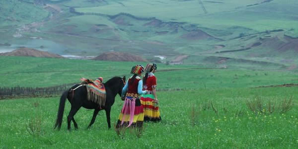 跑馬坪生態(tài)環(huán)境教育區(qū)位于覺嘎失山頂呈波狀起伏的亞高山草甸中,面積達(dá)10萬平方米以上,草甸中部有一長 約200米的天然環(huán)形溝槽,雨季時(shí)溪流清澈但不見首尾。草甸東側(cè)形成若干草甸沼澤化淺水區(qū),且有矮型高山櫟,矮林型杜鵑點(diǎn)綴其中。海拔3105~3185米之間。本區(qū)特色為亞高山灌叢凸現(xiàn)于亞高山草甸中,草甸東側(cè)形成若干草甸沼澤化淺水區(qū)大面積的高山草甸生長著茂盛的中生雜草和和禾草,為糙蘇羽衣草群系。其它主要伴生種有小米草、瀴蔢草、金蓮花、假水蘇禾龍膽等。騎馬徜徉在跑馬坪上讓人覺得天寬地迥,暢意無限。其景觀見圖二