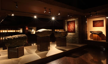 綜合館陳展金、銅、玉、石、陶等各類文物,以類設(shè)題,因題見意,縱向貫通、橫向展開,介紹古蜀歷史及三星堆古蜀國在各個(gè)領(lǐng)域取得的輝煌成就。該館以三星堆遺址全景掛屏為主體展品,以神壇底部一對(duì)造型奇特的神獸為原型制作主體雕塑,輔之以大型壁畫“長江文明之源”。