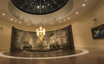 青銅器館以青銅人首鳥身像為主體標(biāo)志性雕塑,輔以大型銅質(zhì)浮雕背屏,通過連續(xù)遞進(jìn)的場景組合,全面系統(tǒng)地展示三星堆的青銅雕像群及一批古蜀青銅神品重器。青銅器館分六個(gè)展廳,分別為:一展廳為“銅鑄幻面,寄載魂靈——奇秘面具”;二展廳為“赫赫諸神,森森群巫——神巫群像”;三展廳為“皇天后土,人神共舞——祭祀大典”;四展廳為“矗立凡間,溝通天地——群巫之長”;五展廳為“千載蜀魂——奇絕的宗廟神器”;六展廳為“心路歷程——三星堆考古錄”。