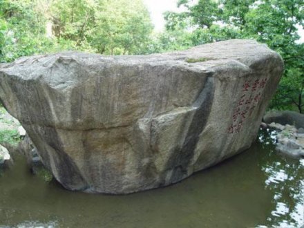 在東西浮青嶺之間山谷中,兩邊是險峻的陡壁,清秀的峰巒,澗谷中彎曲的小溪,清流湍急。當?shù)罊M臥一石,長數(shù)丈,高丈余,上寬下窄,形同元寶,名元寶石,上鐫“此地有崇山峻嶺,怪石奇松。古檀寧椿,“古檀”是密云。寧椿是名字。古密云縣的一位舉人經(jīng)過這里,被盤山的美景吸引住了,他想用一句話來概括盤山的勝景,于是他便借用了晉代著名書法家王羲之的《蘭亭序》中有“此地有崇山峻嶺,茂林修竹”一句,他看到盤山松樹長勢奇特,巖石形狀怪異。因而在這里留下了“此地有崇山峻嶺,怪石奇松”。