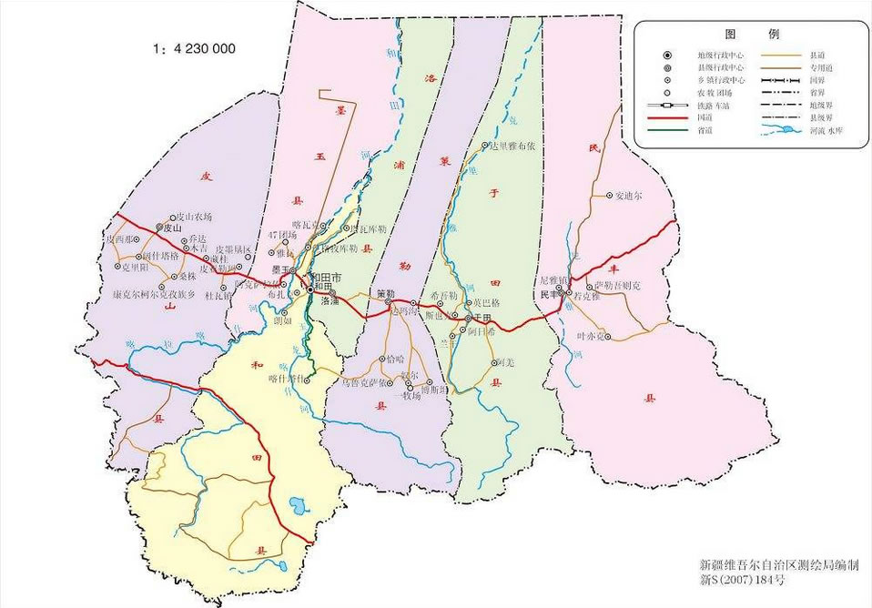 和田地區(qū)位于新疆維吾爾自治區(qū)最南端。南越昆侖山抵藏北高原,東部與巴音郭楞蒙古自治州毗連,北部深入塔克拉瑪干腹地,與阿克蘇地區(qū)相鄰,西部連喀什地區(qū),西南枕喀喇昆侖山與印度、巴基斯坦接壤,有邊界線210千米。東西長約670千米,南北寬約600千米,總面積24.78萬平方千米。
