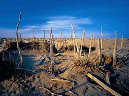羅布泊干涸后,周圍生態(tài)環(huán)境發(fā)生巨變,草本植物全部枯死,防沙衛(wèi)士胡楊樹成片死亡,沙漠以每年3~5米的速度向羅布泊推進(jìn),很快和廣闊無垠的塔克拉瑪干沙漠融為一體。羅布泊從此成了寸草不生的地方,被稱作“死亡之!。