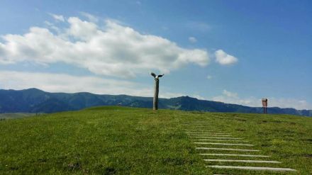 天上的云像是潔白的羊群圍繞著連綿的山峰,又像是奔騰的駿馬馳騁在山谷間。云霧相遇纏繞,仿佛置身于云海之中,故而得名天云臺(tái)。陪伴在天云臺(tái)身邊的是一幅巨型的草原姑娘浮雕,展示了哈薩克族女性的勤勞與善良,仿佛在說:“有朋自遠(yuǎn)方來不亦樂乎”。