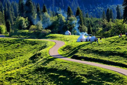 哈薩克語為“美麗的山溝”,是進(jìn)入河谷草原的第一站,擁有一山四景,白雪皚皚的山峰、茂密的森林、連綿起伏的山丘、平坦的草甸,是草原垂直自然景觀帶的窗口。其東側(cè)的山坡形似天山母親的耳朵,聆聽著大地的聲音,默默守護(hù)著天山,被稱之為“天山之耳”。西南側(cè)的山坡形似一匹昂首奔騰的駿馬,見者“馬到成功,飛黃騰達(dá)”被取名為“飛馬坪”。