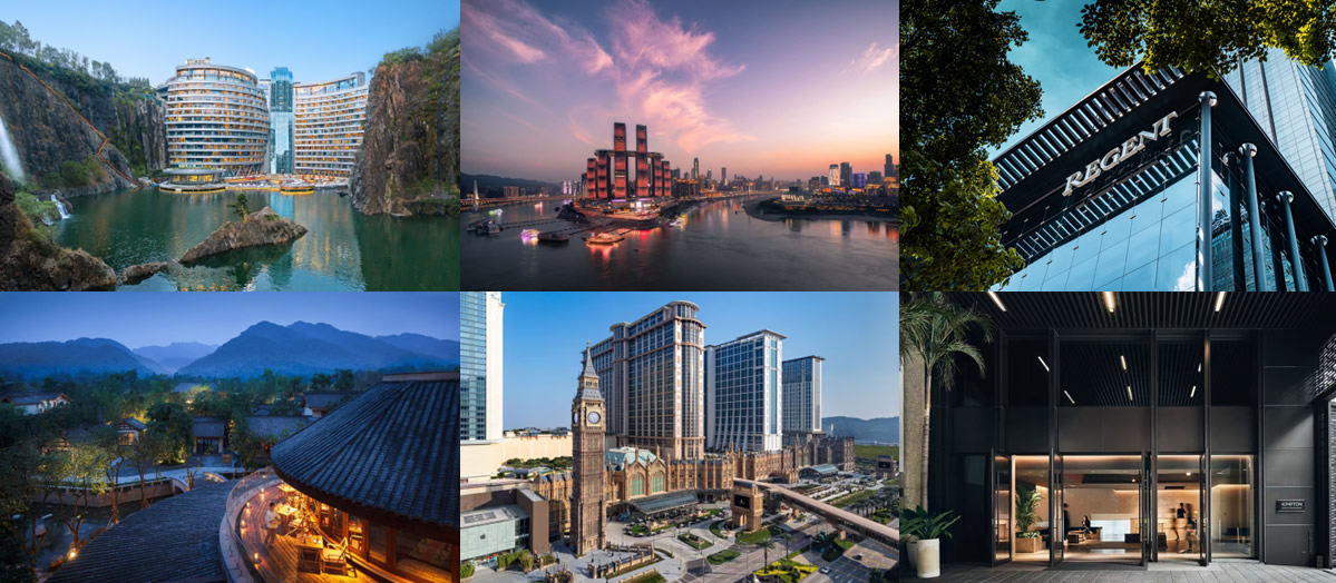 第二行從左至右:青城山六善酒店,洲際度假村聯(lián)盟澳門倫敦人酒店,臺(tái)北金普頓大安酒店