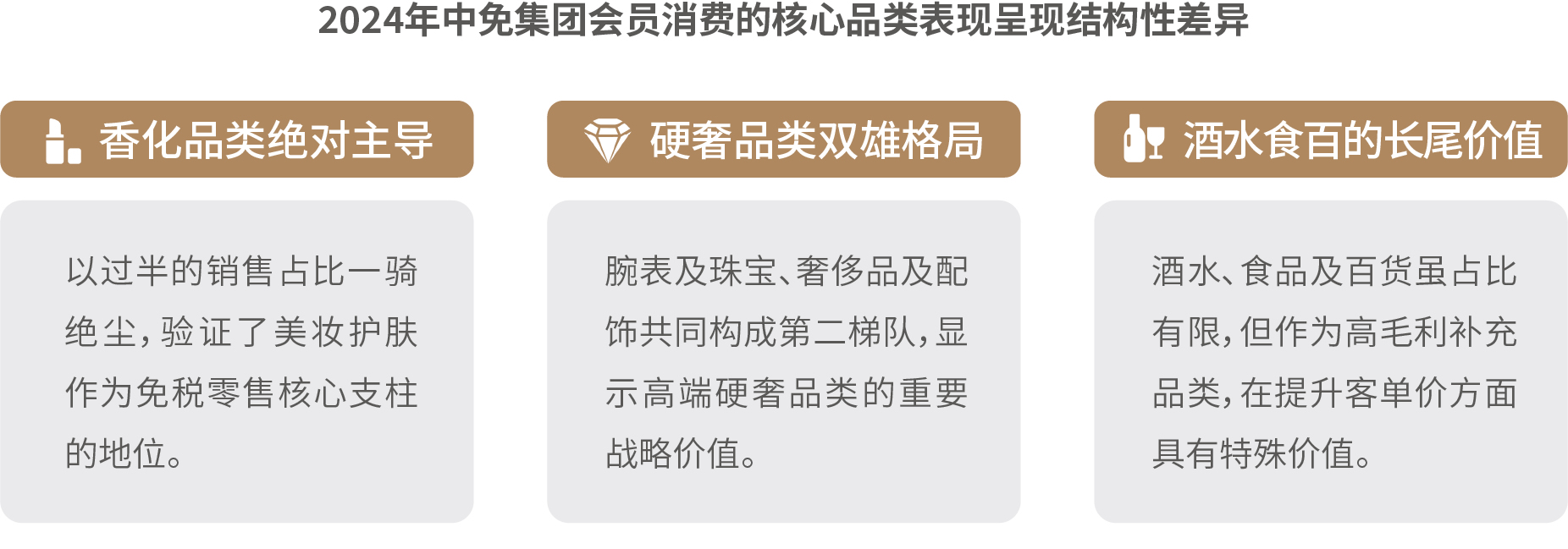 在核心品類消費維度,彩妝香水增長亮眼,外籍旅客、男性客群、國潮品牌成為品類重要的增長點;奢侈品及配飾方面,消費結(jié)構(gòu)多元化,超高端市場增長顯著,輕奢區(qū)間保持穩(wěn)定需求;腕表及珠寶方面,品類分化顯著,首飾品類同比增長,腕表需求區(qū)域性特征突出;酒水方面,市場擴容升級,品類及人群消費分層顯著,渠道互補發(fā)展,呈現(xiàn)出規(guī)模擴張與結(jié)構(gòu)升級并行的顯著特征;食品及百貨方面,市場穩(wěn)健擴容,圈層特征鮮明,Z世代和銀發(fā)人群正在引發(fā)新的情感和健康消費變革。