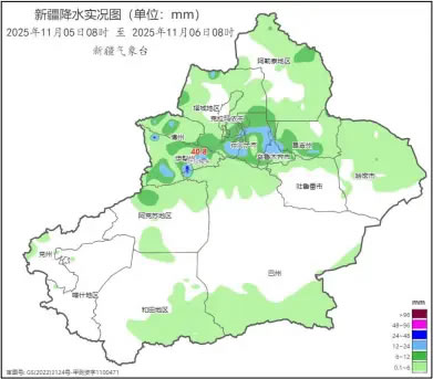 2025年11月5日08時至6日08時新疆降水實況圖 (央廣網(wǎng)發(fā) 新疆氣象局供圖)