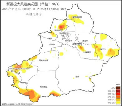 2025年11月5日08時至6日08時新疆大風(fēng)實況圖 (央廣網(wǎng)發(fā) 新疆氣象局供圖)