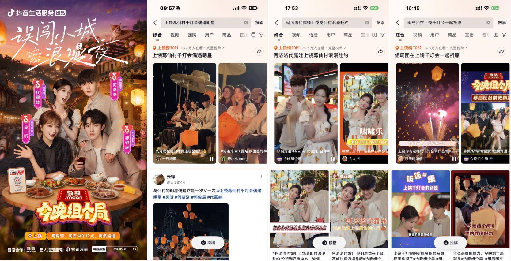 抖音牽手“秋日男友”魏哲鳴前往江西上饒葛仙村拍攝文旅宣發(fā)視頻引發(fā)廣泛關(guān)注,路透內(nèi)容#在葛仙村偶遇魏哲鳴 登上上饒同城榜TOP1;主視頻發(fā)布后,#江西的秋日封神時(shí)刻 更登頂同城榜及全國種草榜TOP6。活動(dòng)還與綜藝《今晚組個(gè)局》實(shí)現(xiàn)聯(lián)動(dòng),吳昕、代露娃、郭俊辰、何洛洛等明星演員前往上饒拍攝定制化文旅內(nèi)容,#上饒葛仙村千燈會(huì)偶遇明星 #何洛洛代露娃上饒葛仙村浪漫赴約 等路透內(nèi)容與節(jié)目看點(diǎn)登頂上饒同城榜TOP1,#組局團(tuán)在上饒千燈會(huì)一起祈愿 搶占同城榜TOP2。明星效應(yīng)有效激發(fā)用戶出行意愿,葛仙村交易額同比403%顯著增長,持續(xù)引爆目的地&商家出圈。