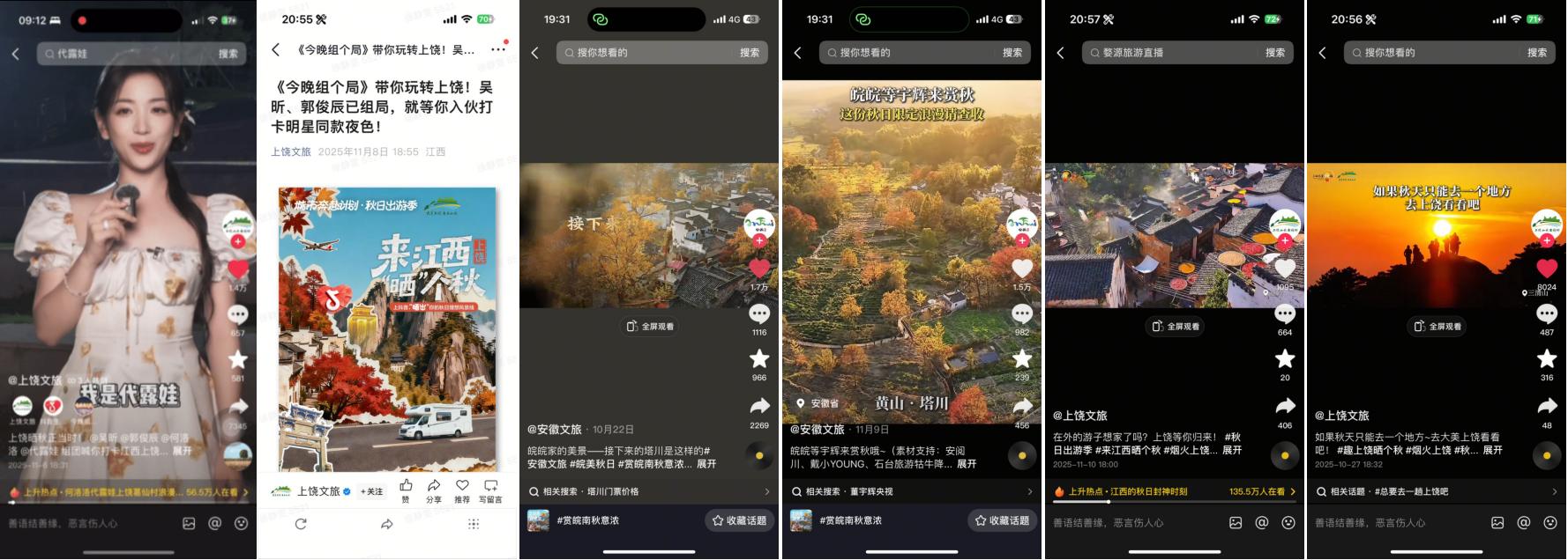 50余位跨界及垂類達(dá)人共同參與秋季種草內(nèi)容創(chuàng)作,整體曝光量突破千萬級(jí)別,覆蓋江西上饒、安徽黃山15家重點(diǎn)頭部商家,以多元化的內(nèi)容視角與持續(xù)的內(nèi)容輸出,形成從點(diǎn)到面的內(nèi)容爆發(fā)態(tài)勢,推動(dòng)江西#婺源曬秋的味道藏不住了 、安徽#潛入徽州的秋日畫卷 等城市賞秋熱點(diǎn)上榜,讓江西與安徽兩地秋景,以更生動(dòng)的方式呈現(xiàn)在用戶面前。