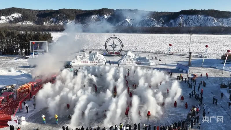 七星廣場上,備受期待的“極寒奇觀秀”在七星廣場震撼上演,身披紅斗篷的居民和游客組成一個巨大的“北”字造型,隨著指令下達,他們同步將滾燙的熱水空中潑灑,在零下三十多攝氏度的極寒空氣中瞬間凝結(jié)成漫天冰晶,銀絮紛飛、弧線交織、光影交錯,構(gòu)成一幅壯闊的極地冰雪畫卷,F(xiàn)場快門聲此起彼伏,大家紛紛用鏡頭記錄這個奇幻瞬間。