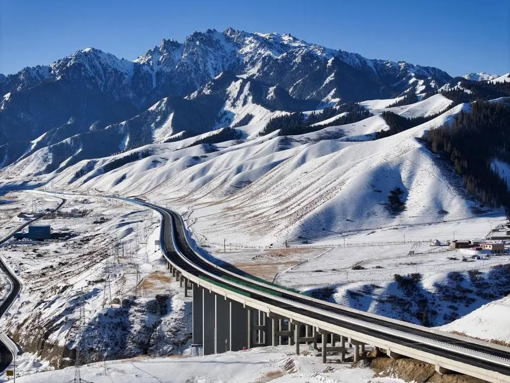 12月下旬,記者驅(qū)車從烏魯木齊前往烏尉高速采訪。寒風掠過天山山脊,皚皚白雪覆蓋著險峻山群,層巒疊嶂之中,一條大道向前鋪展,于天山內(nèi)部打通條條隧道,在崇山峻嶺間架設橋梁。