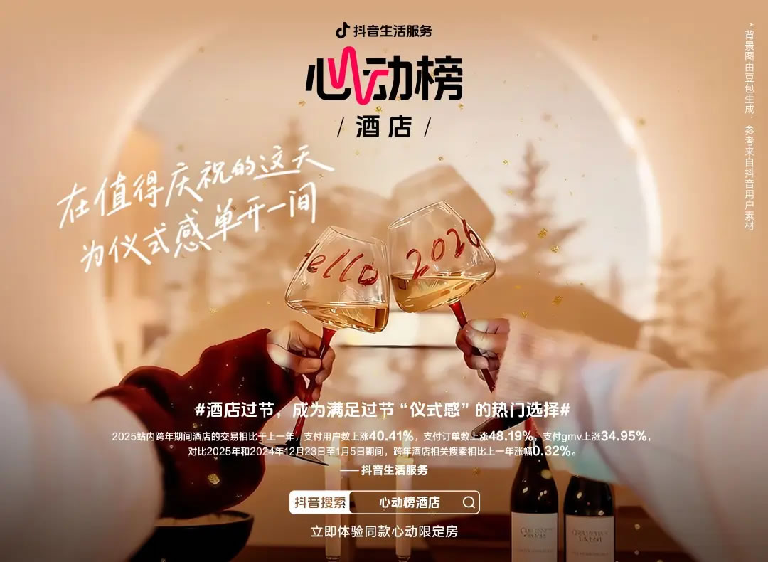 在這場全民性儀式感浪潮中,抖音生活服務(wù)推出的「心動(dòng)榜酒店」之跨年航班和紅人派對(duì),精準(zhǔn)切入并引爆了市場熱度,數(shù)據(jù)顯示,圍繞此類活動(dòng)的內(nèi)容播放量和參與度屢創(chuàng)新高。酒旅行業(yè)的競爭邏輯,正在從傳統(tǒng)的“目的地與價(jià)格”之爭,全面升級(jí)為 “場景營造與情緒共鳴”, 抖音正試圖重塑高端酒店的消費(fèi)體驗(yàn),并重新定義節(jié)假旅行的消費(fèi)決策路徑。