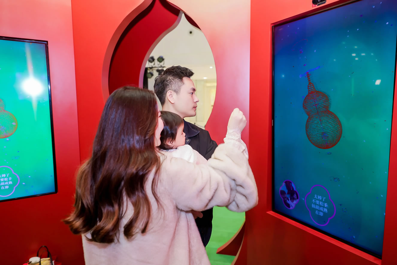 山水,并非遠(yuǎn)行才可得見(jiàn)。書(shū)法水墨藝術(shù)家劉玥首展作品《春山行遠(yuǎn)圖》以20米巨幅“山水開(kāi)卷”,步入其中,與天地春意從容照面;紅色的帷幔落于銀色的松枝上,就像于山間松下靜謐的一隅,“幕下棲心”將是絕佳開(kāi)年時(shí)尚大片的打卡處;松下銀椅,為你與摯友“漫敘往來(lái)”的相聚時(shí)刻營(yíng)造出寧?kù)o、松弛的氛圍;多寶閣中陳列著未經(jīng)雕琢的茶器素胚與場(chǎng)內(nèi)品牌萬(wàn)仟堂,長(zhǎng)沙尼依格羅酒店及tea'stone帶來(lái)的新春茶器,以“初芒蘊(yùn)能”詮釋著未來(lái)的無(wú)限可能與新生力量。轉(zhuǎn)身與“蒔光種愿” 四方亭相遇。葫蘆門(mén)朝四方而開(kāi),寓意著納四方福祿,步入其中,與數(shù)字交互藝術(shù)家吳旭首展作品《無(wú)限福祿》體驗(yàn)互動(dòng),跟隨指引揮動(dòng)手勢(shì),觸發(fā)粒子凝聚為動(dòng)態(tài)“福”字,親手完成一場(chǎng)新春祈福儀式。我們把象征團(tuán)圓與喜悅的紅色沙發(fā)打造“盞間聚暖”,如懷抱般圍合的布局作為“歸處”的隱喻。與家人團(tuán)聚便是心歸處,這將是中國(guó)年最圓滿的意象。