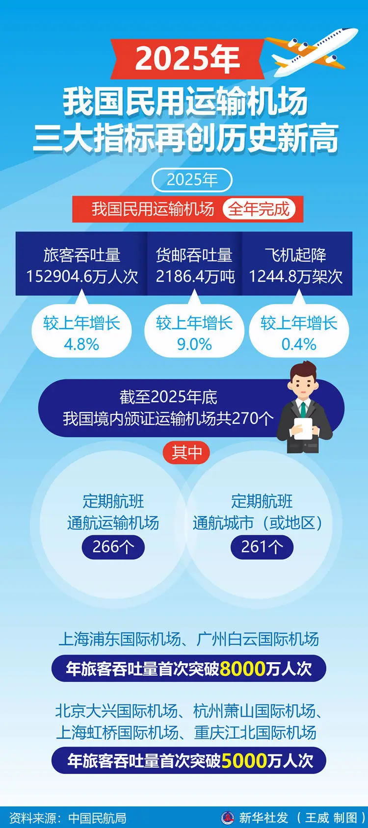 中國民航局當(dāng)日公布2025年全國民用運(yùn)輸機(jī)場生產(chǎn)統(tǒng)計(jì)公報(bào)。公報(bào)顯示,截至2025年底,我國境內(nèi)頒證運(yùn)輸機(jī)場共270個,其中定期航班通航運(yùn)輸機(jī)場266個,定期航班通航城市(或地區(qū))261個。