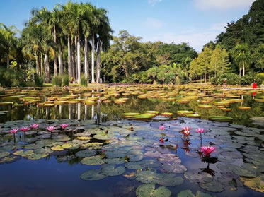 水生植物園水面面積15畝,收集和展示熱帶地區(qū)種類繁多的水生植物,現收集保存了約100種(品種)。該園按照水體深淺等水濕小環(huán)境和植物生態(tài)習性分別種植了不同生活形態(tài)的水生植物,包括:浮葉植物——植物根系或地下莖扎根水底,莖生長于水中,葉柄長度可隨水位而伸長,葉及花朵浮在水面上的水生植物,如王蓮、睡蓮、芡實、萍蓬草。浮水植物——植株整體漂浮于水面,根部不生于泥中,可隨水流四處漂泊的植物,如雨久花、滿江紅、鳳眼蓮、美洲槐葉萍、紫萍、大漂、眼子菜、荇菜。沉水植物——完全的水生植物,大部分生活周期中植株沉水生活,它們多生活在水較深的地方,根長在土里,葉片通常呈線形、帶狀,如金魚藻、黃花貍藻、黑藻等。挺水植物——下部或基部沉于水中,根或地下莖扎于泥中生長發(fā)育,上部植株挺出水面,通常生長在淺水或水邊的水生植物。如荷花、紙莎草、畦畔莎草、水蔥、長節(jié)淡竹芋、白粉塔里亞、水芋、水生馬蹄、撒金澤瀉、澤瀉、黃花藺、千屈菜、蔗草、菖蒲、慈姑、黃花鳶尾。濱水植物——生長在岸邊或堤岸潮濕的地方,喜水耐濕,如水杉、落羽杉、水松、木芙蓉等。
