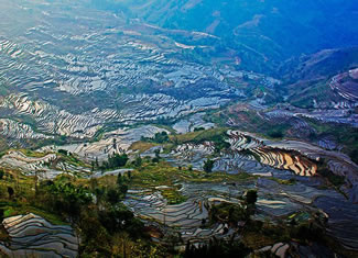 元陽梯田,位于云南省紅河州元陽縣的哀牢山南部,是哈尼族人世世代代留下的杰作。元陽梯田是紅河哈尼梯田的核心區(qū)。紅河哈尼梯田是以哈尼族為主的各族人民利用特殊地理氣候同墾共創(chuàng)的梯田農(nóng)耕文明奇觀,規(guī)模宏大,氣勢磅礴。元陽哈尼族開墾的梯田隨山勢地形變化,坡緩地大則開墾大田,坡陡地小則開墾小田,甚至溝邊坎下石隙也開田,因而梯田大者有數(shù)畝,小者僅有簸箕大,往往一坡就有成千上萬畝。