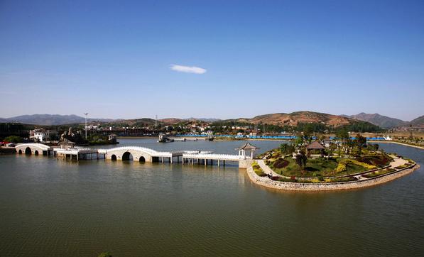 太陽湖位于縣城南郊,東臨巧威公路過境線,西接鳴樓自然村,占地面積320畝。園區(qū)整體布局主要由水體湖面、小島嶼、環(huán)湖公路和商業(yè)區(qū)四個(gè)部分組成。太陽湖呈蝴蝶型鑲嵌于城郊平壩中央,水體面積為16萬平方米,湖面水深2.2米。湖畔有島嶼3個(gè),在島上設(shè)置了八角亭及長廊等江南風(fēng)格園林設(shè)施,拱型廊橋?qū)⒐聧u與小島連為一體,形成湖中有島、小島四面迎水的秀美景觀。