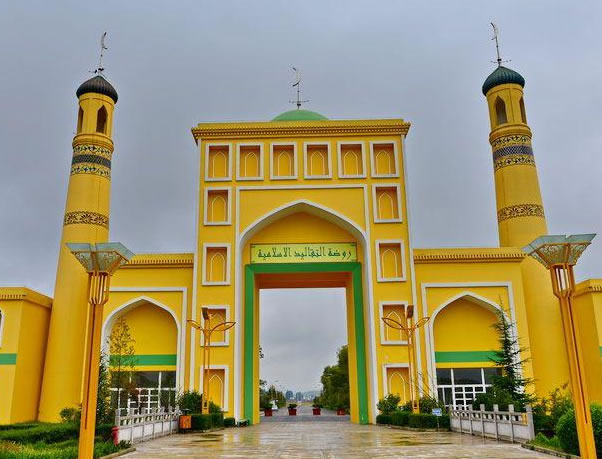 伊斯蘭風(fēng)情城是結(jié)合當(dāng)?shù)氐锰飒?dú)厚的自然環(huán)境和回族聚居條件建設(shè)起來的,占地334畝,其中水體面積100畝,中軸線長1000米,除了入口廣場區(qū)外,還按南北空間系列分布著宗教文化展示區(qū)、演示區(qū)、水上游樂區(qū)和休閑購物區(qū),“一軸五區(qū)”就是伊斯蘭風(fēng)情城的總體布局。伊斯蘭教信奉真主,認(rèn)主獨(dú)一,反對偶像崇拜,禁止以物喻主。信教群眾膜拜真主,每天從早到晚有5次虔誠禮拜的儀式,稱作“禮五番”,到了周五,信教群眾就近到清真寺聚眾禮拜,稱作“注姆爾”,俗稱“主麻”。禮拜之前,每個(gè)人都必須沐浴干凈,務(wù)必常帶“大凈”,勤洗“小凈”,因而用于洗浴的茶壺也就成了信奉伊斯蘭教的一種普通標(biāo)識。