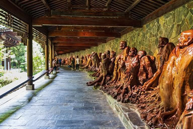 以根雕藝術(shù)展現(xiàn)佛教文化的圣地,是由千年樹神匯聚的藝術(shù)殿堂,建筑面積1.2萬平方米,縱深有三座大殿,第一幢為雙層結(jié)構(gòu),第二第三幢均為單層結(jié)構(gòu)。兩邊另有羅漢文化長(zhǎng)廊依山而建,環(huán)繞其間,有未來佛殿、大雄寶殿、羅漢堂等,陳列有釋迦牟尼、未來佛、四大菩薩、四大天王、五百羅漢等佛教文化系列巨型根雕作品一千余件,其中最大的根雕釋迦牟尼主佛,形體龐大,重達(dá)40余噸,根材花巨資,于中緬邊境一路繞道跋涉而來,經(jīng)醉根“點(diǎn)化”,巍然成佛!五百羅漢陣更是氣勢(shì)雄偉,長(zhǎng)達(dá)680余米,整體布局渾厚古雅,堪稱中華一絕、世界之最。