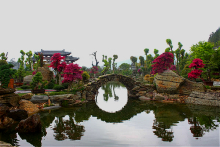 地處根宮佛國(guó)文化旅游區(qū)山麓,緊依根雕佛國(guó),有醉松亭、日月亭、回思廊、靜心亭、樂禽園等景觀建筑,陳列有以松柏類為主的盆景藝術(shù)作品1500余盆,造型博采眾長(zhǎng),創(chuàng)意自然,有小橋流水田舍人家的水旱盆景,有濃縮華山天險(xiǎn)附石盆景,有的以石為盆回歸自然,有的三五成林意境高遠(yuǎn),大自然的千奇百怪,于方寸間一覽無余,具有空中花園美譽(yù)。