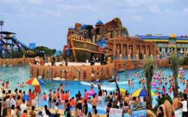 水世界:占地面積90畝,以地中海地區(qū)的地理風貌為原型,以中東地區(qū)的文化背景和世界名著《一千零一夜》的故事為主題。建有一千零一夜戲水區(qū)、地中海海浪區(qū)、土耳其古城區(qū)、颶風灣探險區(qū)和更衣室、商鋪、醫(yī)療中心、迷童中心等相關配套服務設施,擁有亞丁風暴、幼發(fā)拉梯、辛巴飛毯、波塞冬碗、多哈滑道和愛琴藍海(海浪區(qū)、海嘯區(qū))等大型水上游樂設備和游樂區(qū)域,游客容量在10000人以上。
