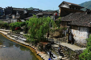 小橋如虹霓跨溪,上面長滿了綠藤,橋下水聲依依,站在不遠(yuǎn)處的水埠上,半圓的橋拱與水中的倒影正好構(gòu)成了一個圓,水波蕩漾,恍如一輪圓月,此景被叫做“楓溪望月”確是名不虛傳。