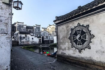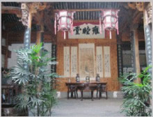 鐘池四周伸展出八條小巷,特點(diǎn)各個(gè)不同,形成了坎、艮、震、巽、離、坤、兌、乾八個(gè)部位。大公堂就在它的坎宮部位,從它的正門邊上東而去的一條十分幽深,一層層的臺(tái)階上坡,左側(cè)是綠蔭如蓋的園子,的一右側(cè)是一排排住宅的后墻,這條巷是通往村中十八廳堂之一的積慶堂的。鐘池東面條巷子很平直,100米長。八條小巷似通卻閉,似連卻斷,虛虛實(shí)實(shí),猶如一張蜘蛛網(wǎng),又宛如一座迷宮。