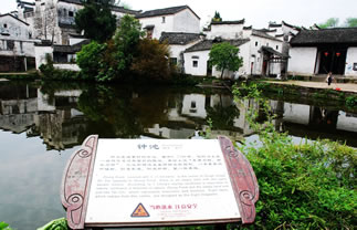 鐘池位于諸葛村的中心,在大公堂正前面,面積0.24公頃,它的邊上是一塊與它逆對(duì)稱面積的陸地,村民用以曬場之用。易經(jīng)上說“東南為陽、西北為陰”再加上“天圓地方”之說,空地和鐘池正呈陰陽太極圖形。陸地靠北和鐘池靠南各有一顆水井,正是太極中的魚眼。鐘池的南岸是一個(gè)陡坡,順著陡坡而建的幾幢大房子從北岸望去一幢比一幢高,加上前面貼水一溜小平房,跌宕起伏,輪廓線大起大落,景象峭拔而優(yōu)美。